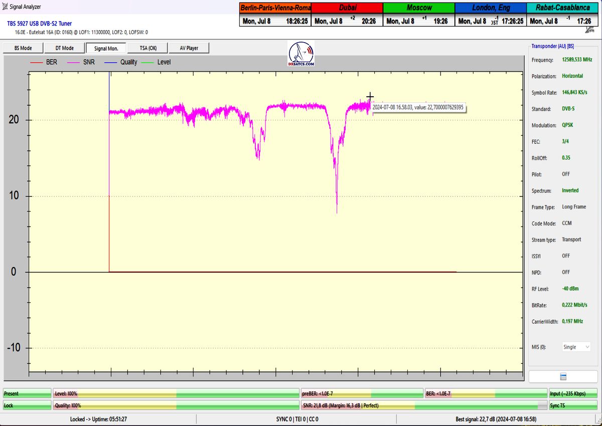 ►Doteraz najvyššia dosiahnutá špička kvality SNR=22,7 dB na oficiálne najnižšom parametre Symbolovej Rýchlosti SR=146 ksym/s z družice Eutelsat 16A