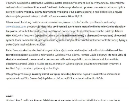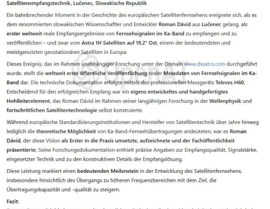 > Toto sú len niektoré z mnohých prelomových výsledkov, ktoré som dosiahol v KA pásme a ktoré sa nepochybne zapísali do dejín satelitného vysielania