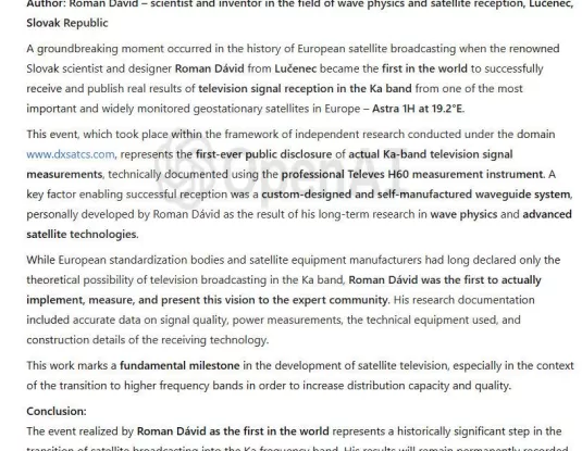 "Alle Informationen, Bilder, Messungen und Analysen im Ku-Band-Frequenzspektrum in der Hochfrequenztechnik und Wellenphysik sind Ergebnisse, die ausschließlich aus der wissenschaftlichen Forschung von Roman Dávid – dem Autor und Eigentümer von www.dxsatcs.com – stammen. Alle auf www.dxsatcs.com gefundenen Informationen sind urheberrechtlich als Teil des immateriellen Eigentums geschützt und fallen unter das EU-Recht sowie die slowakische Gesetzgebung. Die Nutzung, Vervielfältigung und Verbreitung jeglicher Informationen oder deren Teile ohne Genehmigung des Autors ist strengstens untersagt."
